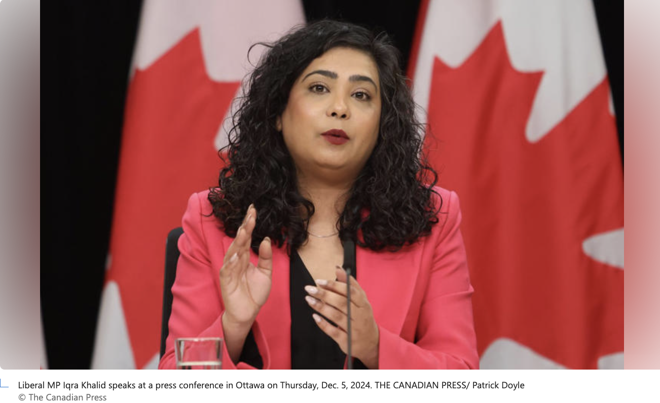 Ontario MP Iqra Khalid said Tuesday she was pushed after trying to check on a member of the roughly 30-person delegation who was pulled aside for additional questioning after the group had been at the Allenby Crossing for several hours.