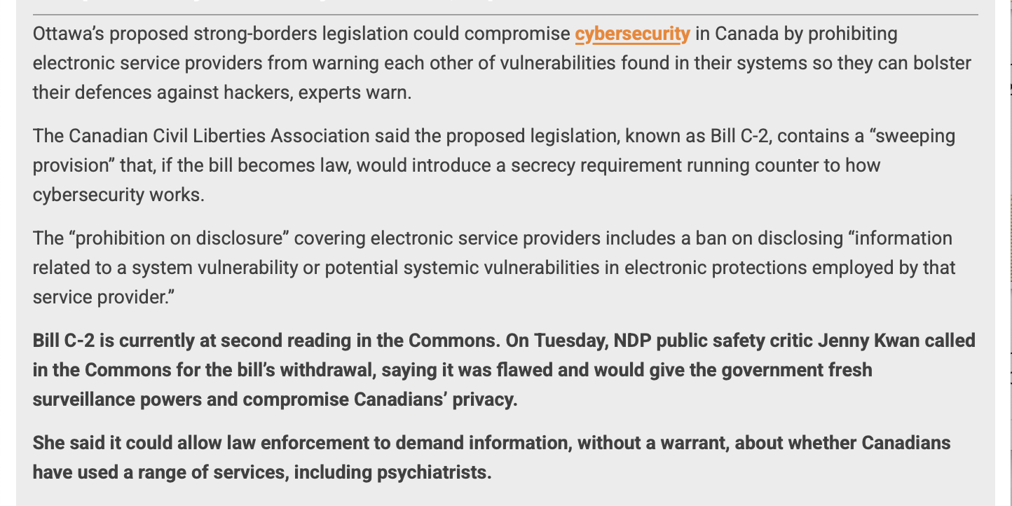 Bill C-2 is currently at second reading in the Commons. On Tuesday, NDP public safety critic Jenny Kwan called in the Commons for the bill’s withdrawal, saying it was flawed and would give the government fresh surveillance powers and compromise Canadians’ privacy.