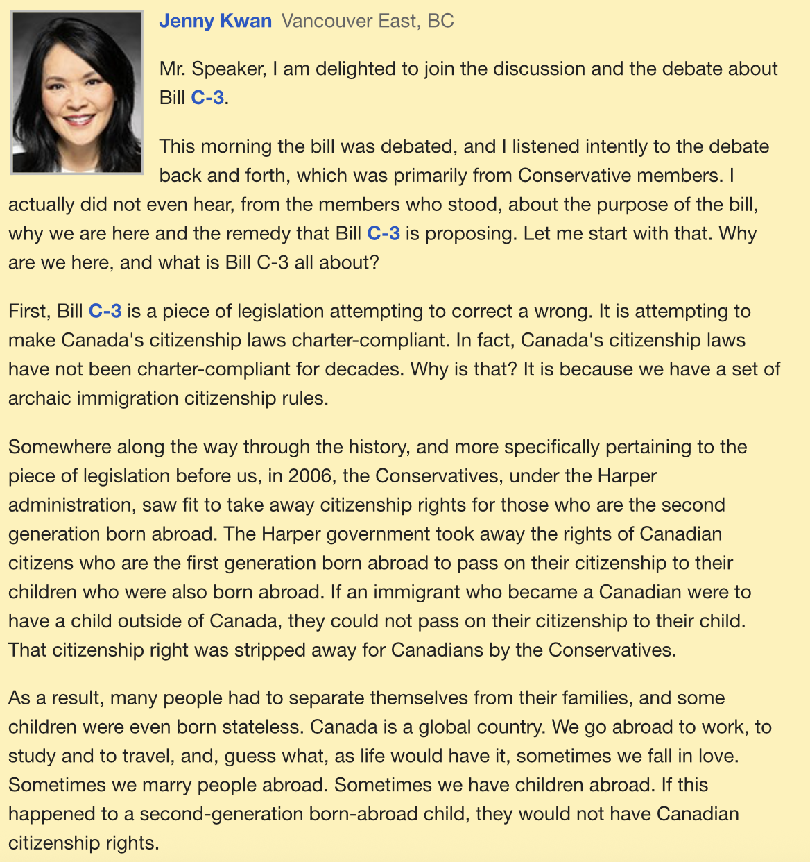 First, Bill C-3 is a piece of legislation attempting to correct a wrong. It is attempting to make Canada's citizenship laws charter-compliant. In fact, Canada's citizenship laws have not been charter-compliant for decades. Why is that? It is because we have a set of archaic immigration citizenship rules.