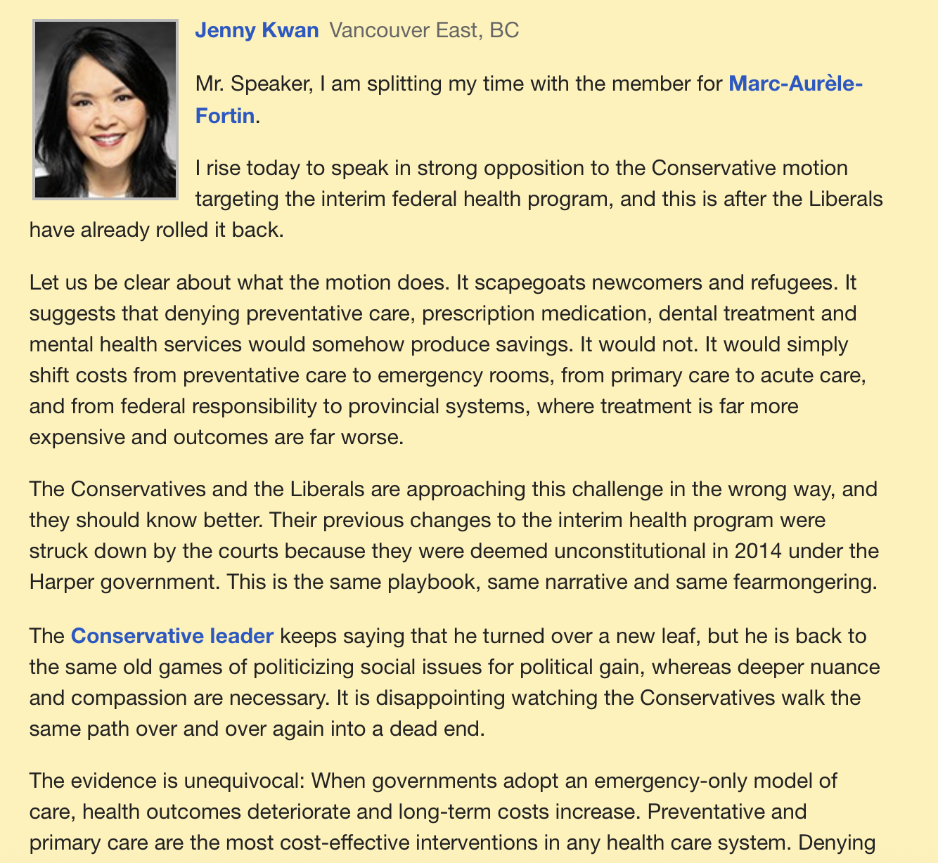 Let us be clear about what the motion does. It scapegoats newcomers and refugees. It suggests that denying preventative care, prescription medication, dental treatment and mental health services would somehow produce savings. It would not. It would simply shift costs from preventative care to emergency rooms, from primary care to acute care, and from federal responsibility to provincial systems, where treatment is far more expensive and outcomes are far worse.