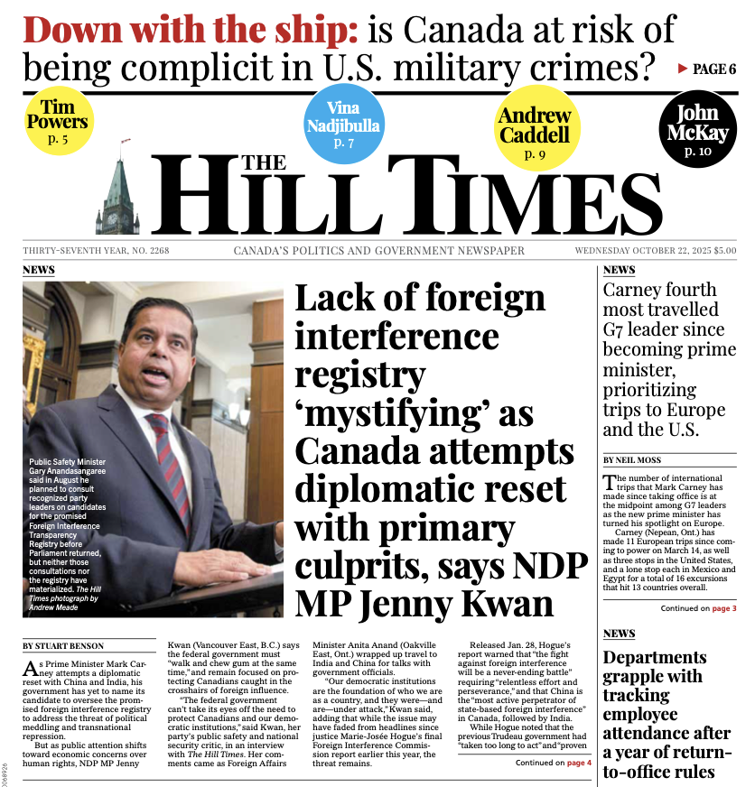 “The federal government can’t take its eyes off the need to protect Canadians and our democratic institutions,” said Kwan, her party’s public safety and national security critic, in an interview with The Hill Times. Her comments came as Foreign Affairs Minister Anita Anand (Oakville East, Ont.) wrapped up travel to India and China for talks with government officials.