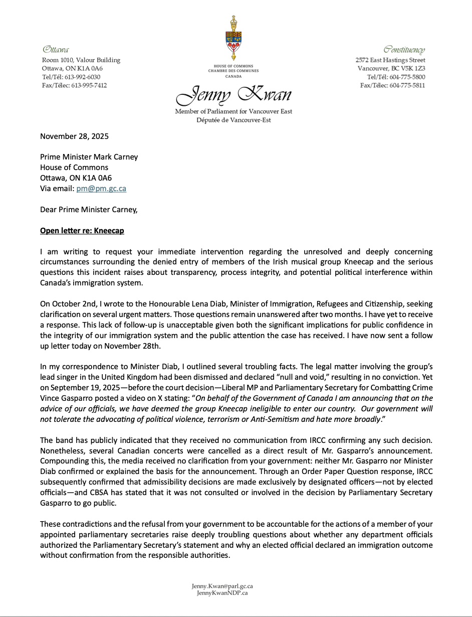 I am writing to request your immediate intervention regarding the unresolved and deeply concerning circumstances surrounding the denied entry of members of the Irish musical group Kneecap and the serious questions this incident raises about transparency, process integrity, and potential political interference within Canada’s immigration system.